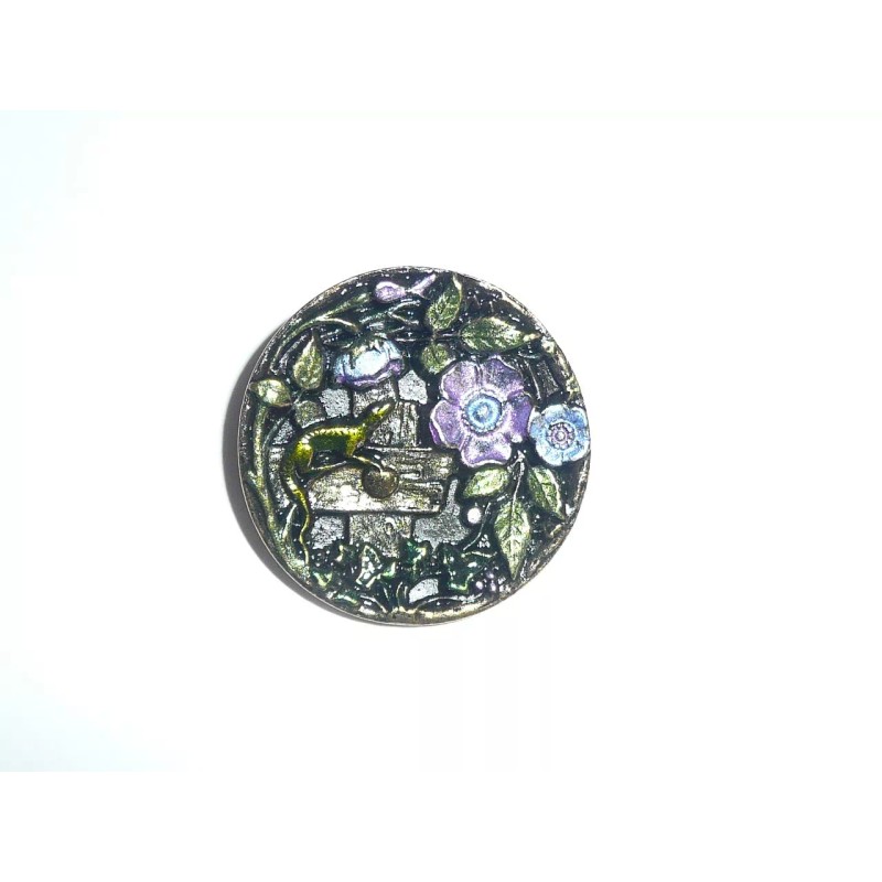 Hand Painted Antique Reproduction Flowers & Lizard Metal Shank Button