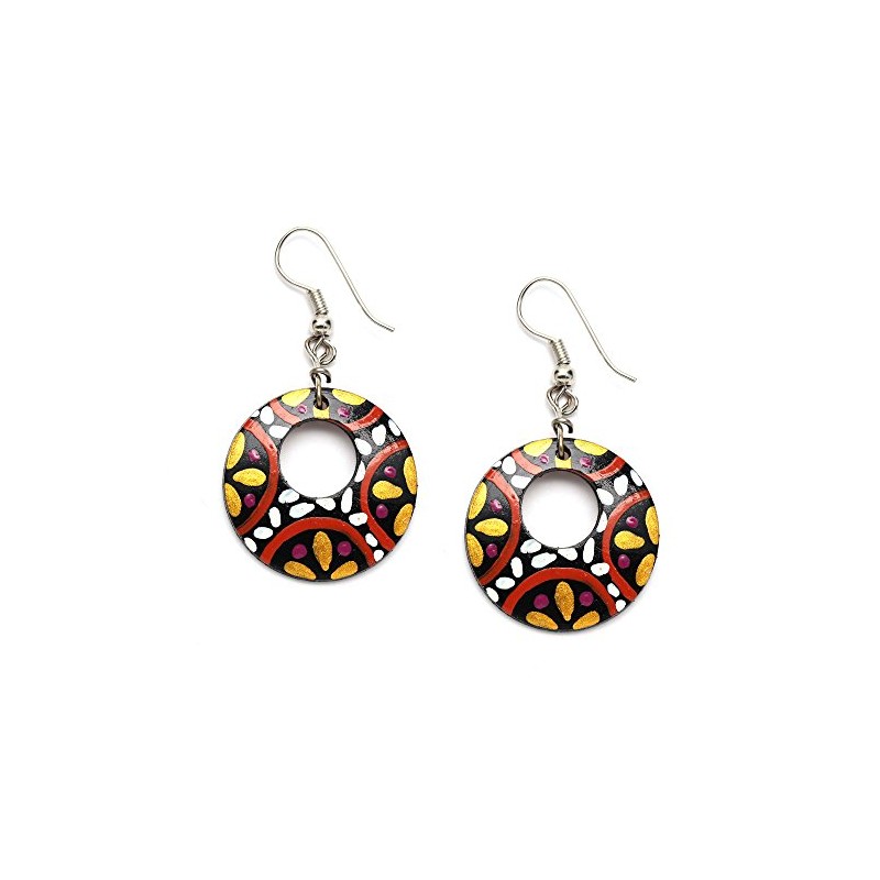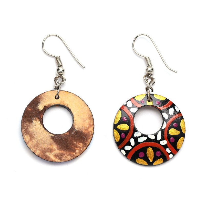 Hand painted white petals and golden colour flowers coconut shell open hoop drop earrings
