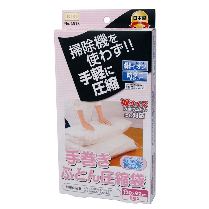 | Material Type: | 材質圧縮袋:ナイロン(特殊ポリエチレン)、抗菌防臭・防ダニ不織布:ポリプロピレン、スライダー:ポリエチレン、シール:PET |