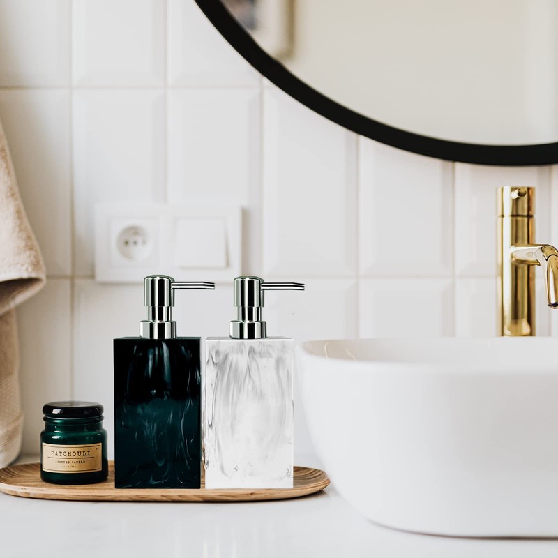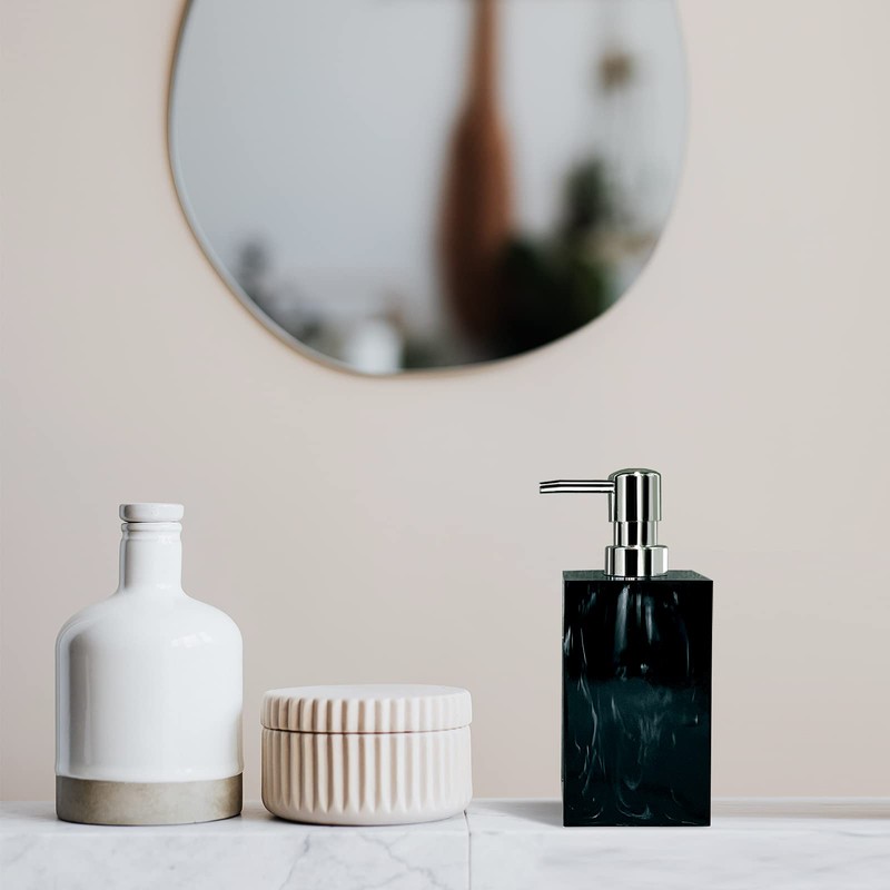 - Classy look of marble swirl perfectly matches bathroom and kitchen. Made of solid and durable resin to avoid breakage, Crafted form high-quality resin material, very durable and safe for your family. It can hold all kinds of liquid, such as shampoo, shower gel, emulsion, hand soap and so on.