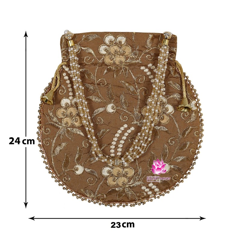 Handbag Embroidered Floral Indian Ethnic Potli bag for Women Ladies Batwa Wedding Jewelry Gifts Pearls Clutch Drawstring Purse (H*L:9 * 9.5 In) (Dark Gold)