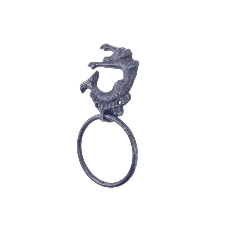 Handcrafted Nautical Decor Rustic Dark Blue Cast Iron Arching Mermaid Towel Holder 9"