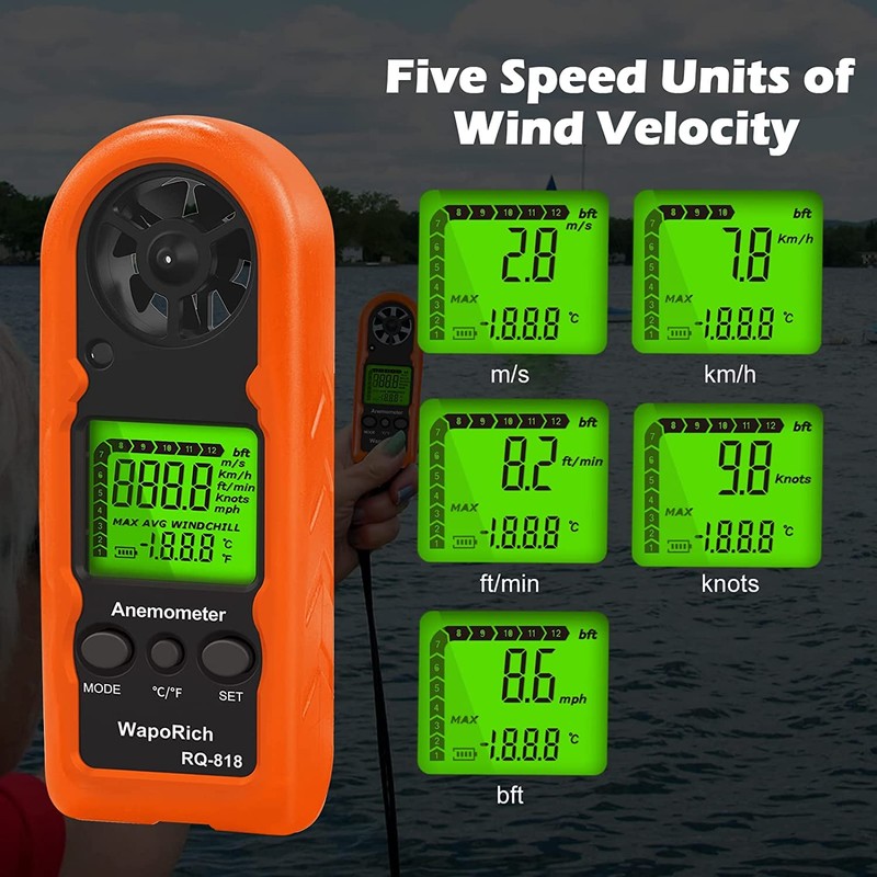 - 【Multifunctional Anemometer】WapoRich RQ-818 has the function of measuring wind speed/temperature/chill indication/max/average/current. This digital anemometer is ideal for outdoor activities such as drone wind speed testing, sailing, hang gliding, shooting, HVAC duct airflow, weather monitoring, fishing, measuring air conditioning, etc.