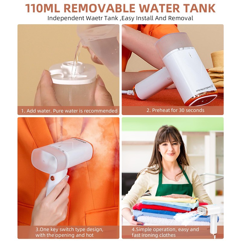 - [SAFE & EASY TO USE]This portable handheld steamer is designed in such a way that it won't harm clothing materials, so you can use it with confidence.It has a gentle effect on clothes of different fabrics.Before use, please add water to the water tank and then press the power button, you will soon be able to produce a steady stream of steam. The compact size of the Steamer and the ergonomic handle provide a comfortable grip and allow you to slide the steamer effortlessly over your clothes.