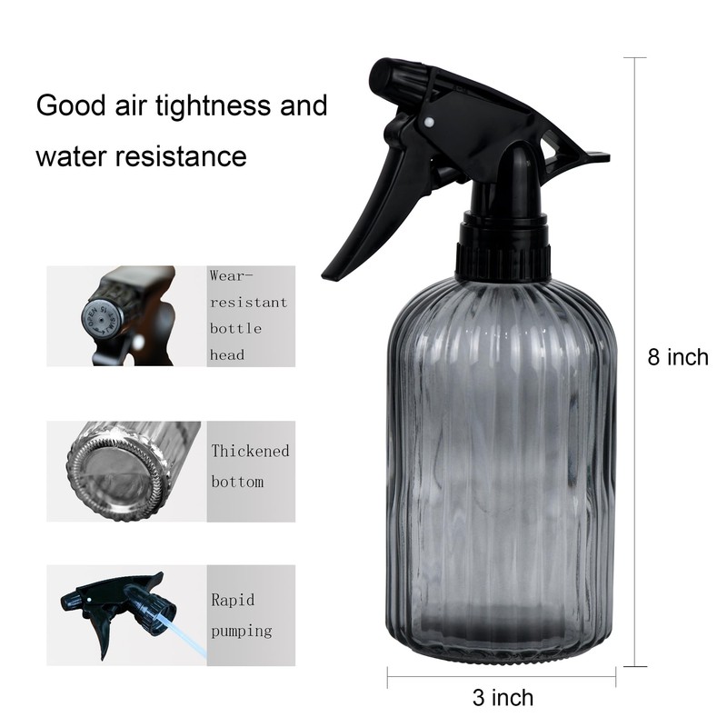 • Exquisite design: the product adopts vertical glass bottle, thick threaded nozzle, black plastic nozzle on the top, hand-held pressurised, automatic spraying without leakage, simple and generous shape.