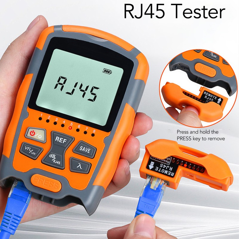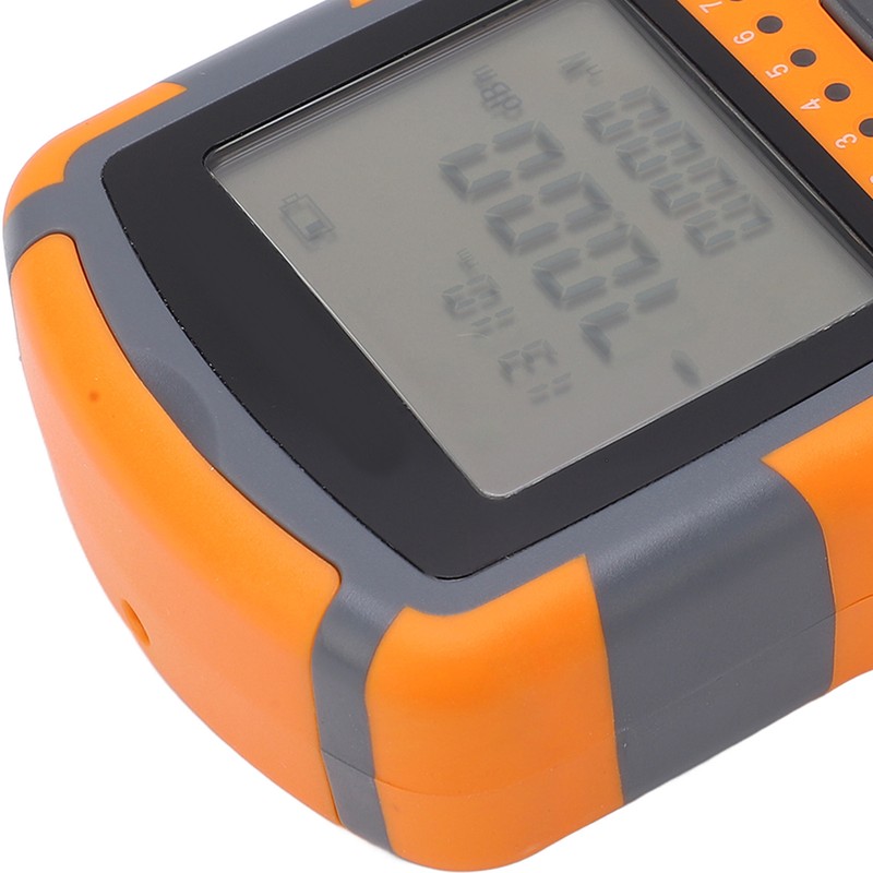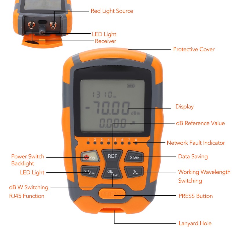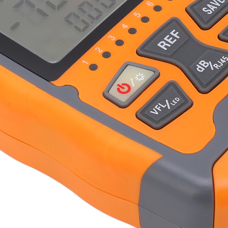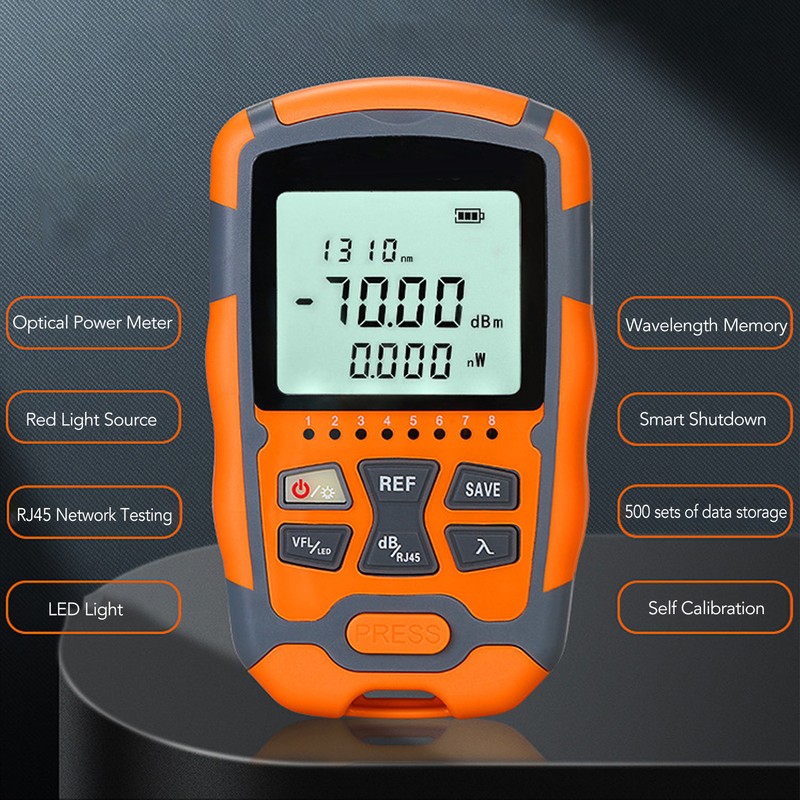 1、MEASURING RANGE: Multifunctional optical power meter, power measurement range is ‑70‑10dbm, fast and accurate in operation, no need to wait for warm up. 2、GOOD PERFORMANCE: The optical fiber tester uses sensitive chip, with relative power calculation and calibration functions, stable and reliable performance. 3、10 WAVELENGTHS: With 850, 980, 1270, 1300, 1310, 1490, 1550, 1577, 1625, 1650nm standard wavelengths, multiple sets of data storage, store and view at any time. 4、PORTABLE DESIGN: The optical power meter is handheld design with a compact internal structure, and uses ABS plastic shell, lightweight and wear resistant. 5、MULTIPLE FUNCTIONS: Integrated network test, optical power meter, red light source and LED light, covering most of the needs of communication maintenance.