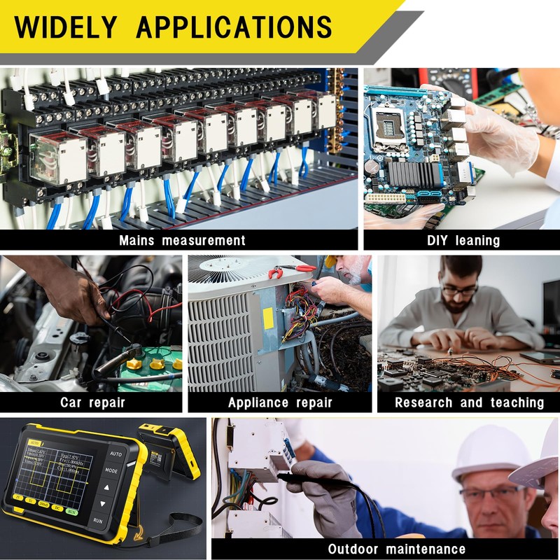 • Versatile Applications Our oscilloscope is suitable for a variety of applications, including supply measurements, DIY, auto repairs, household appliance repairs, research and teaching as well as outdoor maintenance. It supports the measurement of different parameters and provides a variety of waveform measurements to meet your daily needs.