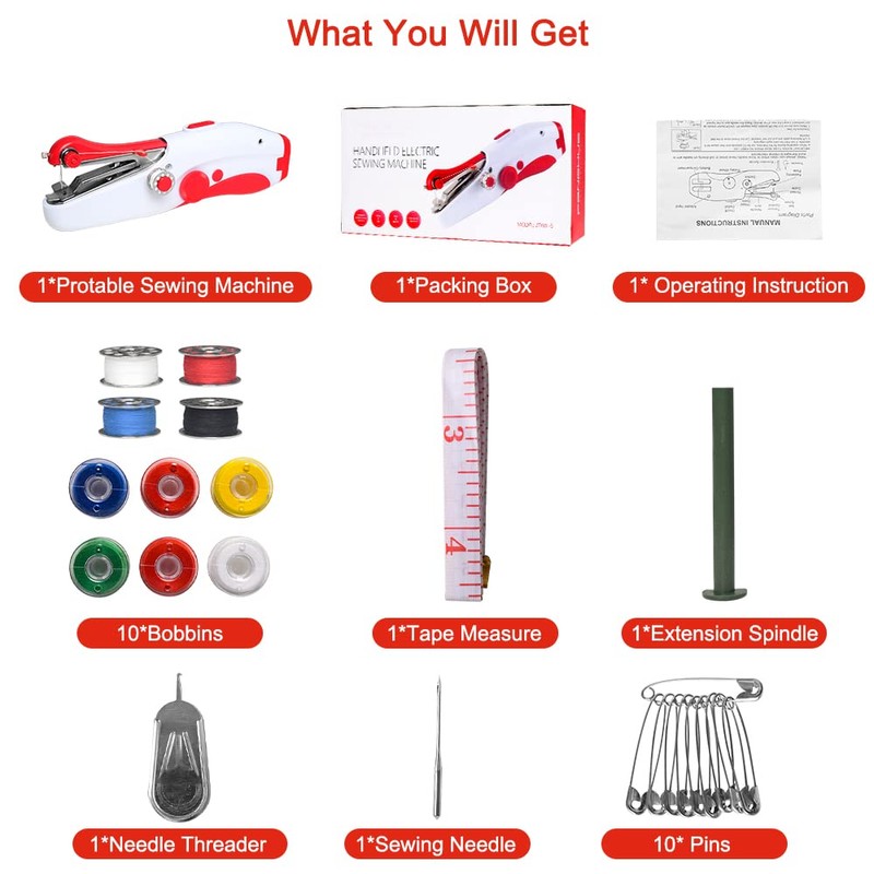 - 【Complete Tools】:The box includes: 1 * Mini Protable Sewing Machine, 8 * Bobbins, 10 * Safety Pins, 1 * Tape Measure, 1 * Sewing Needles, 1 * Long Rods, 1 * Needle Threaders, 1* Operating Instructions. The tools are complete, you can use it directly without buying other things
