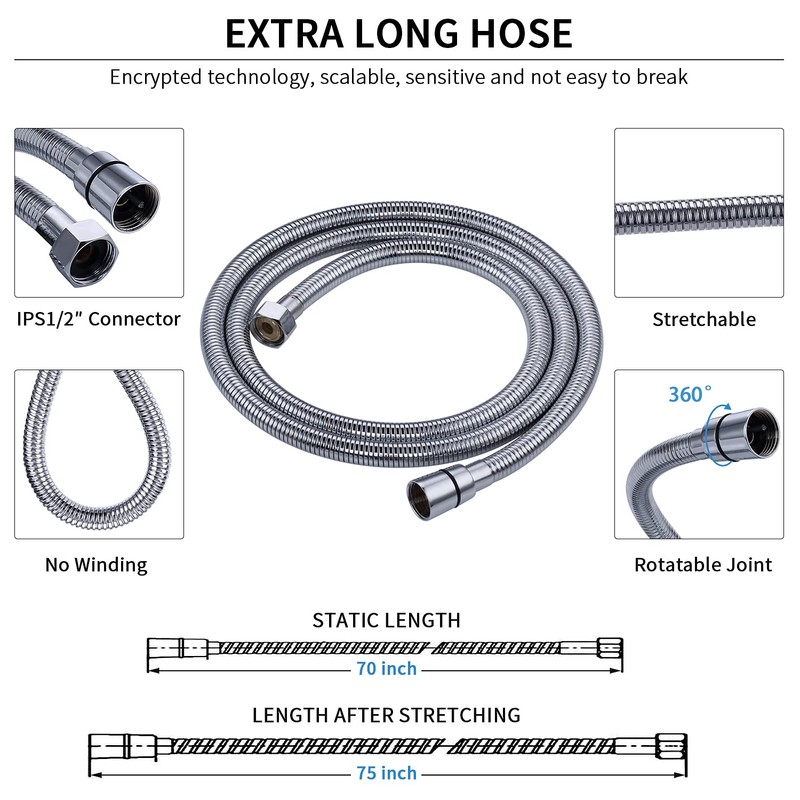 The stainless steel hose is 75”, super flexible and extra long. One inch the length adds, more convenience you get. When you want to shower the kids, or the pets, or spray your tube, toilet or the whole bath area, this extra long hose becomes a super star! It’s long enough, with no winding, very slinky. Don’t forget to connect the cone nut with the shower head handheld, and connect the hex nut with the outlet of bracket.