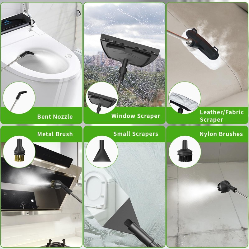 - Versatile 15-Piece Accessory Kit: Includes 2 nylon and 1 brass brushes, 2 nylon nozzles, 2 flat scrapers, 1 window scraper with towel cover, 1 extended nozzle, 2 gloves, 1 needle for cleaning scale, 1 wrench and 1 storage bag. This cleaning steamer kit is perfect for cleaning kitchen grease, car interiors, glass, grout, and more