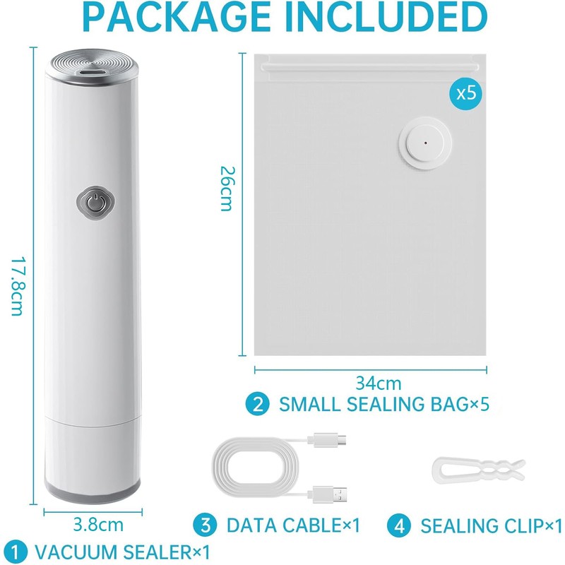 - Package Included: The vacuum sealer novice set includes 5 large sealed bags(26"×34"), 1 sealing clip, 1 data cable and 1 wireless rechargeable vacuum machine. Vacuum locks freshness, change the traditional way of preservation from now on!