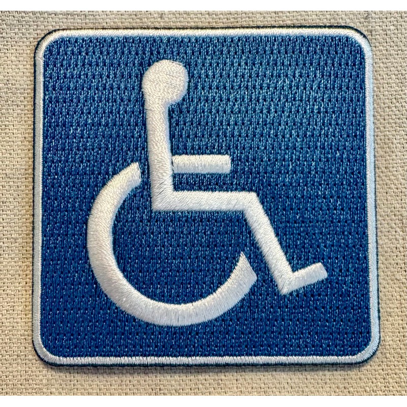 This brand new embroidered patch depicts a classic Disabled Persons or Handicapped logo/road sign. Perfect for your biker vest, jacket, or bag. Heat-seal backing allows buyer to iron this patch onto virtually any fabric.