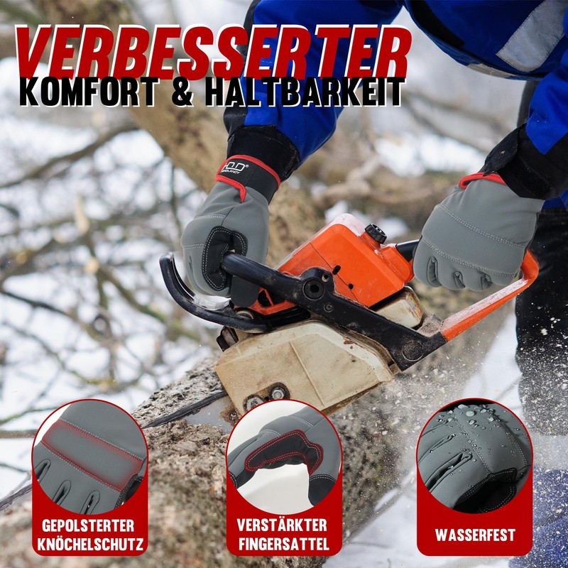 - DURABLE MATERIAL The palms and heavy duty thumb saddle of these thermal work gloves are reinforced with leather material to increase durability and protection. The back of the gloves is made of water-repellent material to keep your hands pleasantly warm and dry even in light moisture.