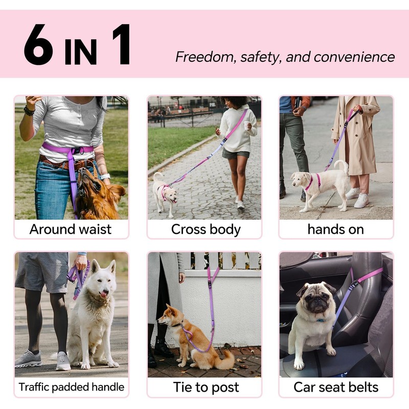 - Multifunctional Design: The length is adjusted by the buckle of the dog strap. The dog strap can be used as a shoulder strap, belt and cross strap. The belt length can be adjusted from 17 to 53 inches. Reflective strips are designed to be visible early in the morning or late at night, allowing pets to walk safely. Good shock-absorbing design, bungee cords protect you and your dog from injury.