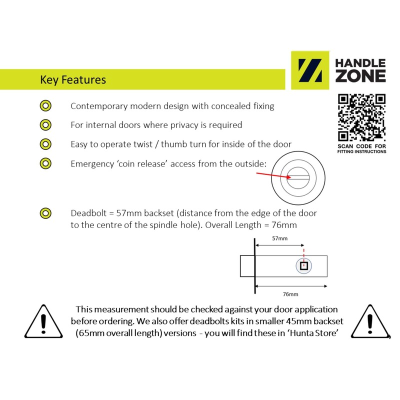 - APPLICATION: Suitable for use on domestic internal bathroom / toilet doors, or where privacy is required. Can be used on left or right handed doors. Fitting instructions / templates available - just scan the QR code on the packaging