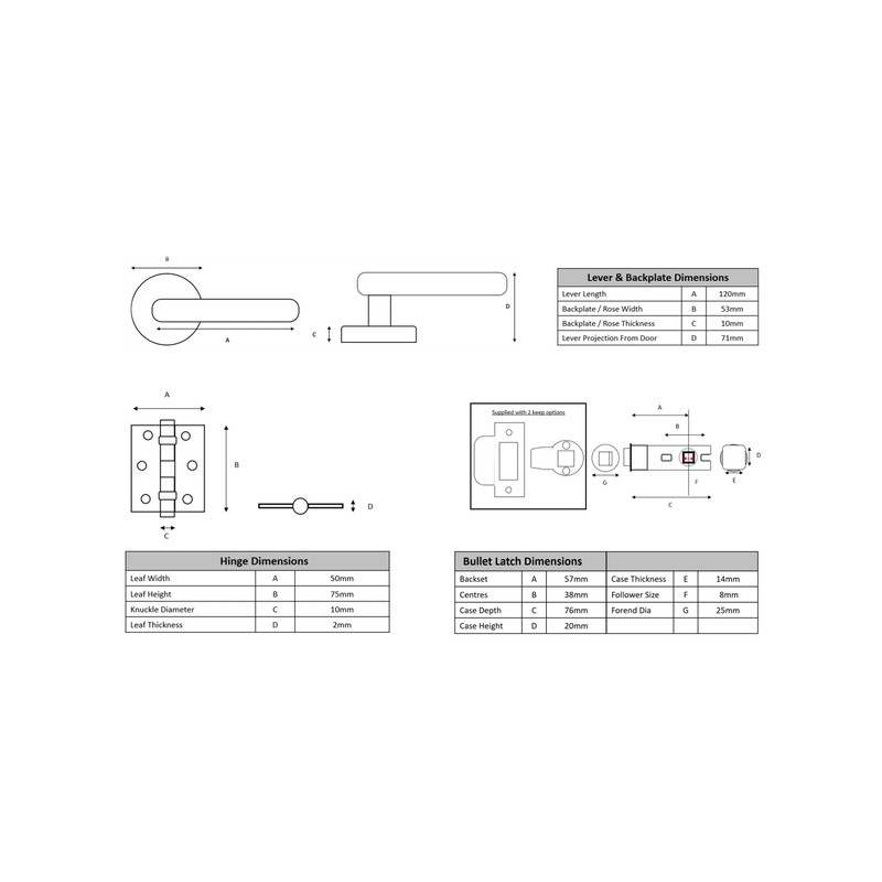 - FINISH & MEASUREMENT: Handles - Black Matt. Hinges - Black Matt 75x50mm. Bullet Latch - Black Matt 70mm (57mm backset)