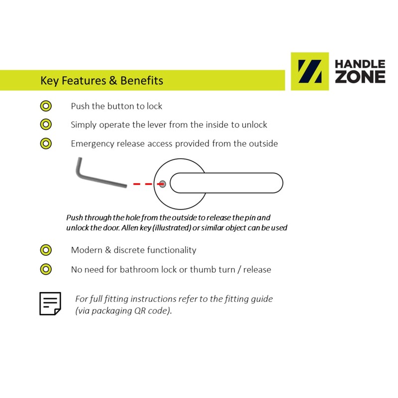 • APPLICATION: Suitable for domestic internal bathroom / toilet doors, or where privacy is required. Can be used on left or right handed doors. Fitting instructions / templates available - just scan the QR code on the box