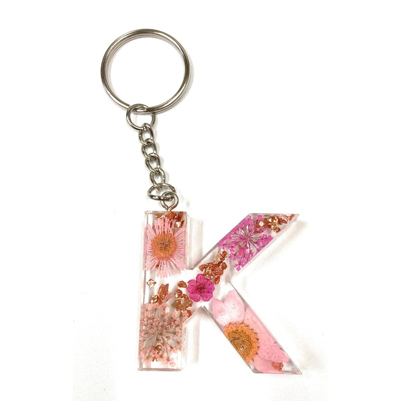 Handmade A-Z Letter Keyring with Pink Pressed Flowers and Rose Gold Foil. Ideal Keychain Gift or Bag Charm (K)