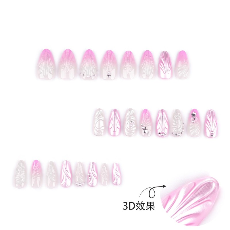 Handmade Almond Shaped Press-On Nails Pink 3D Shell Pearls Medium Long False Nails Crystal Nails Reusable False Nails Kit Glossy Full Cover Glue Nails for Women 24pcs