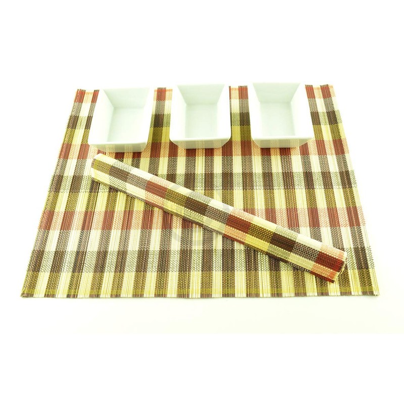 The placemats are made of treated fine bamboo sticks, which are used in their natural wood colours of light brown (cream colour). Different colours are also delicately dyed on the bamboo (without overshadowing the natural wood grain) illustrating contemporary styles for placemats. The sticks are finally laced together with colourful strings, with each combination of various colours of bamboo sticks and strings creating elegant and eye catching check patterns.