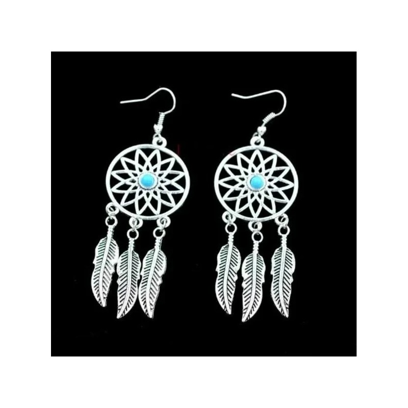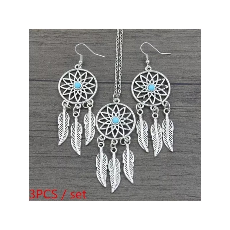 Handmade Bohemian Style Dreamcatcher Earrings and Necklace Set -Pendant, Feather Silver