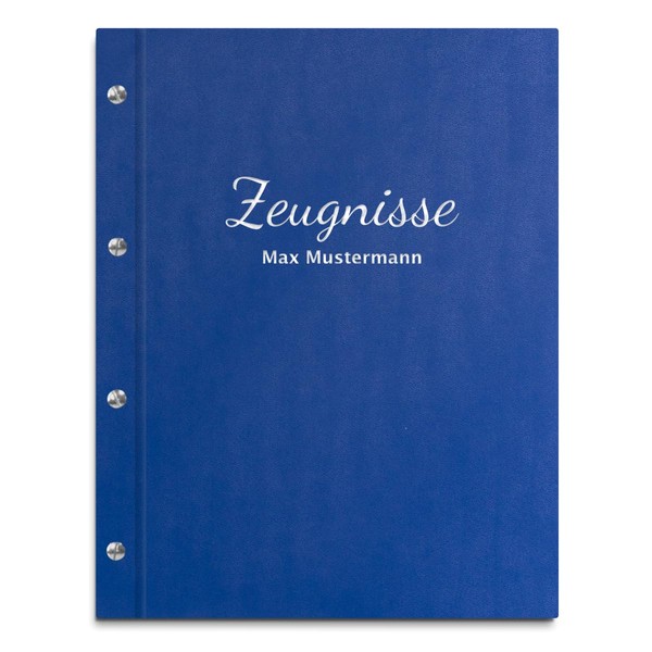 • Personalise your certificate folder with your name or desired text. The first line consists of the lettering "Zeugnisse". The second line can be individually written. The inscription is hand-embossed in gold, silver, metallic blue or metallic red.