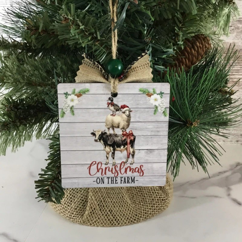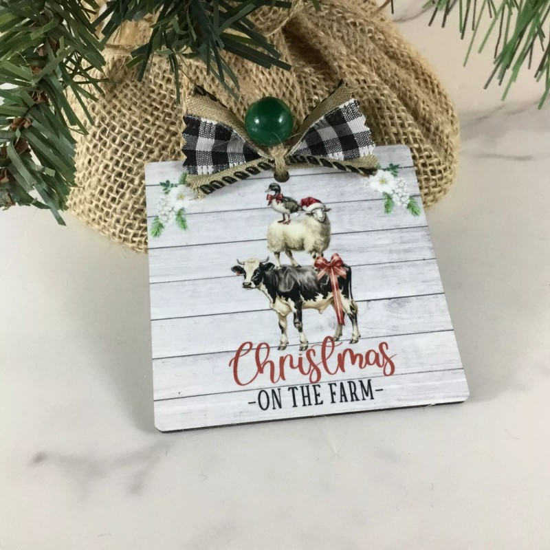 Celebrate the holidays with this charming "Christmas on the Farm" Wooden Ornament This 3.5" square wooden ornament showcases a fun scene with a duck standing on top of a sheep, who is standing on top of a cow, all set against a rustic barnwood background. Perfect for adding a touch of farm fun to your Christmas decor.