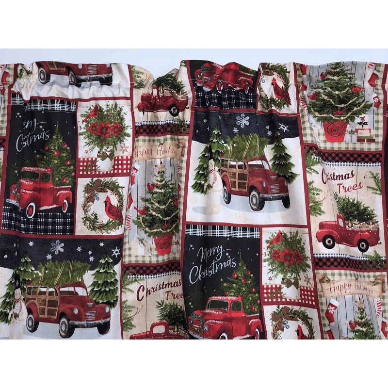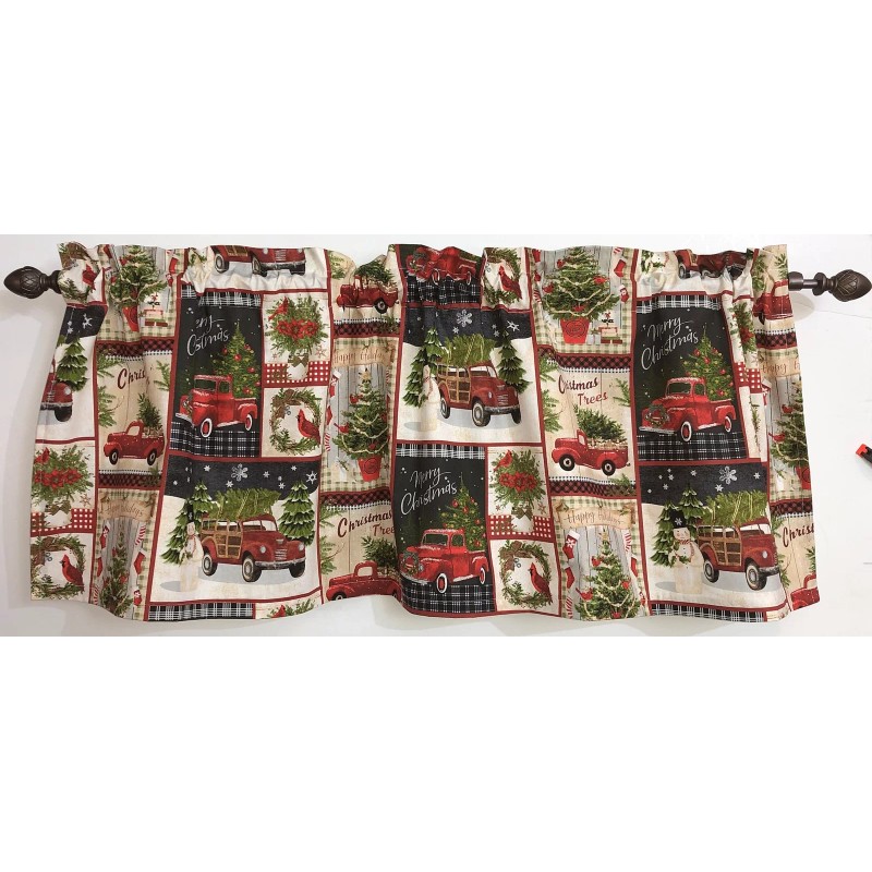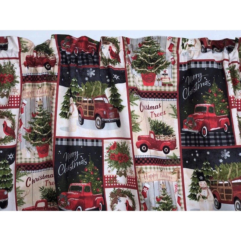 Christmas Tree Collage Valance Red Pick Up Truck Cardinal Bird Patch Window Curtain Topper