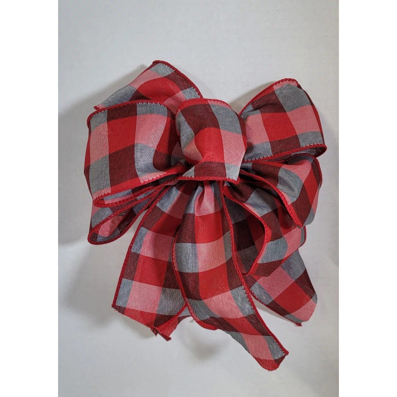 HANDMADE CHRISTMAS WREATH BOW RED & GRAY BUFFALO CHECK LANTERN BOW 9" TREE BOWS