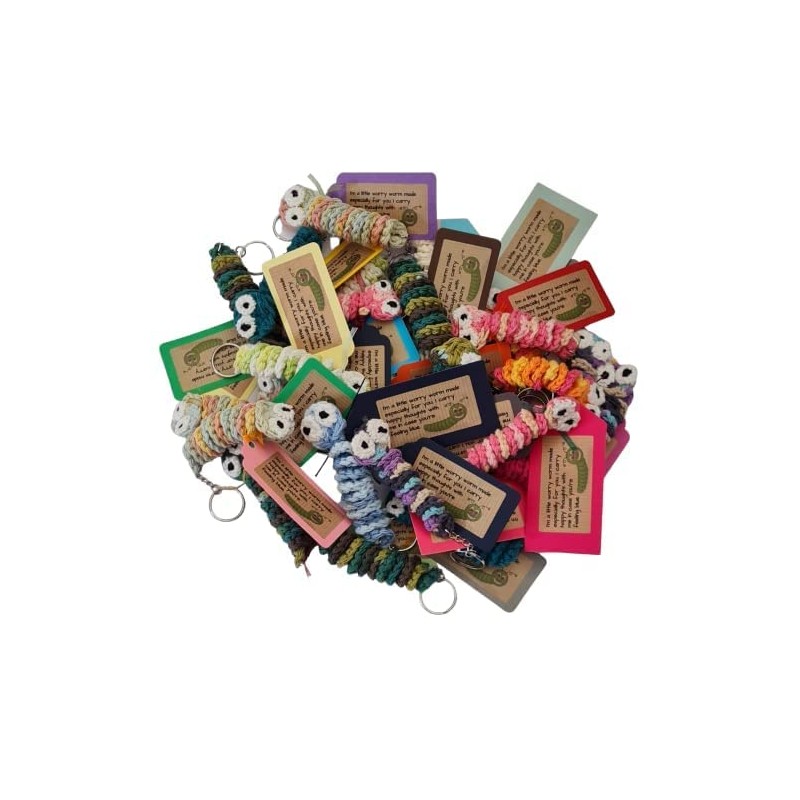 Handmade Crochet Worry Worm Sensory Keyring For Stress, Anxiety, Children, SEN, Dementia (Yellow/White)
