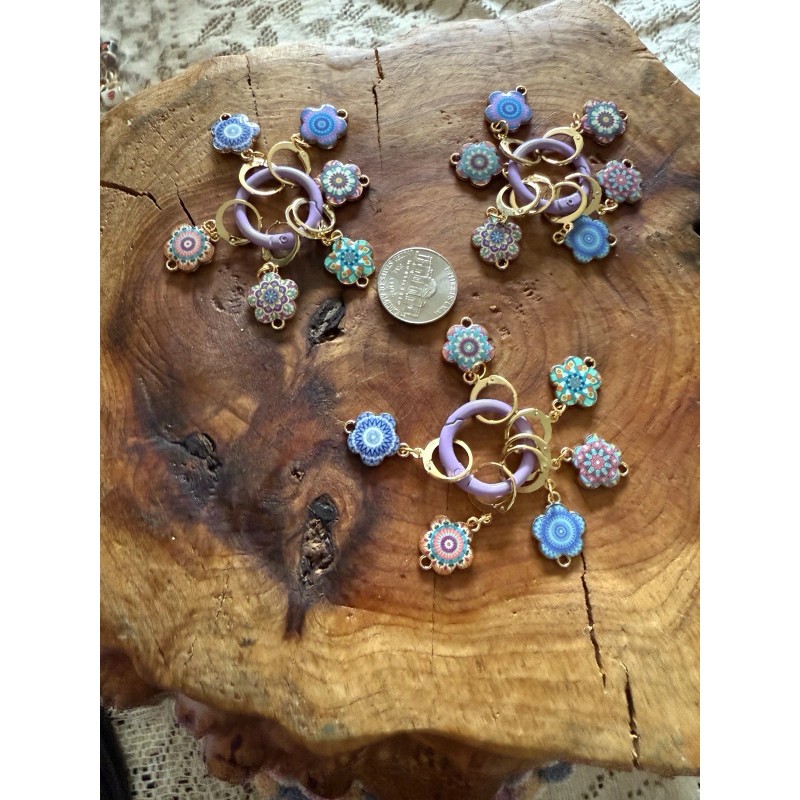 Arts and crafts yarn markers are small, colorful markers used to keep track of different strands of yarn while working on a craft project. These markers are essential for ensuring that each strand is clearly labeled and easily identifiable, making it easier to keep track of your work and prevent mistakes. Perfect for knitting, crocheting, or any other yarn-based craft project, these markers are a convenient and practical tool for organizing your creative process. Each comes with 5 markers with 14 k gold closures. May be used as earrings.