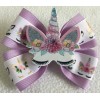You are looking at an unicorn hair bow. There are two layers of grosgrain ribbon. The top ribbon layer has a white background with different unicorns allover. The under layer is in a solid light purple ribbon. The French barrette is in a matching light purple ribbon. There is a big decorative unicorn flat back on the front. The bow is approximately 4" wide and 2 3/4" from top to bottom at the tallest part. This is a handmade item.