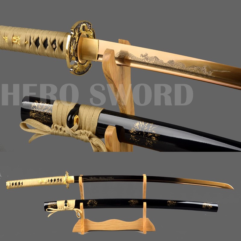 Handmade Gold Blade Japanese Samurai Sword Hand Etching engrave Gold Dragon Katana Full Tang Sharp Can Cut Bamboo Trees (Gold Dragon Katana)