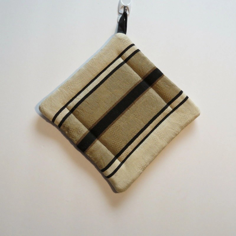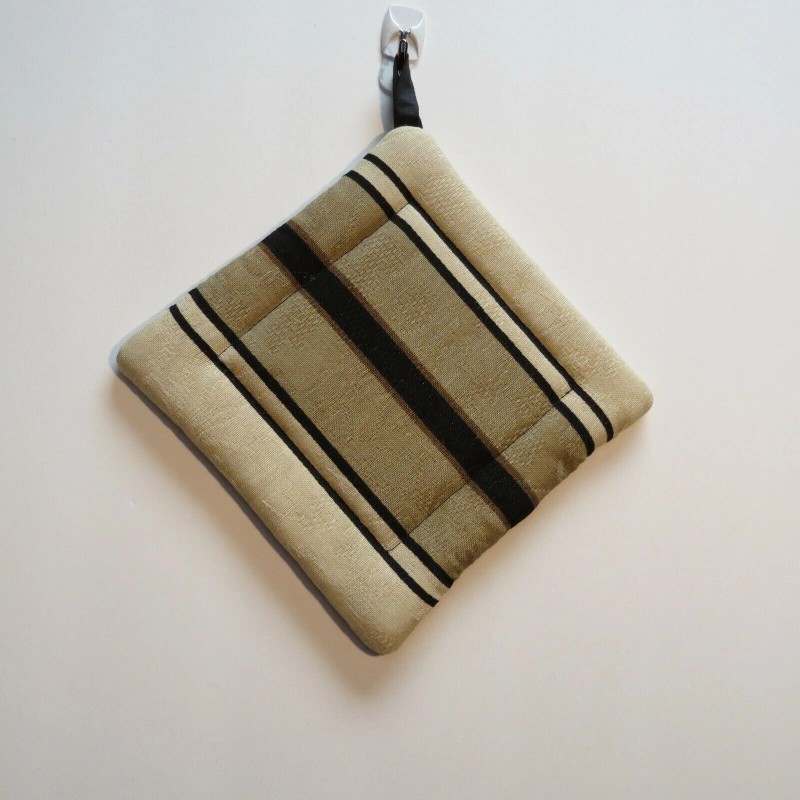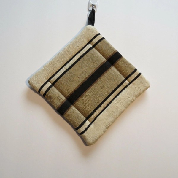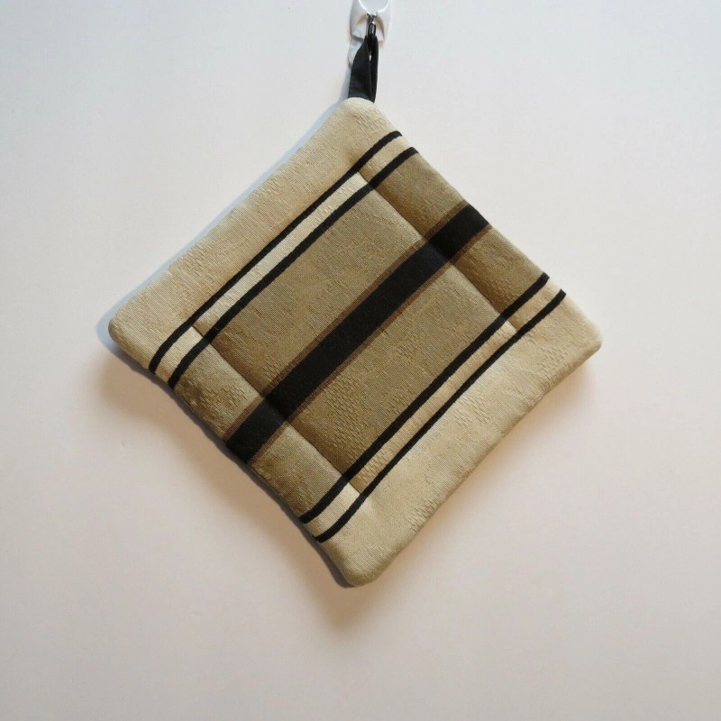 Handmade Hot Pad Trivet Pot Holder Black Tan Stripe Quilted 7 inch Square Corner Loop