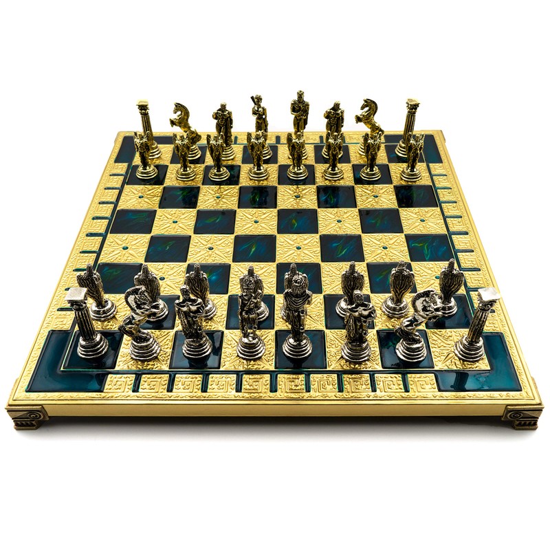 - Our chess sets are handmade by our artisans Greece. The wooden board is individually painted and bonded with high quality designer resin and the chessmen are hand casted in metal. The chest set comes in a luxury wooden box. The box is designed to hold and organize each piece along with the board. Everything fits perfectly and organized.