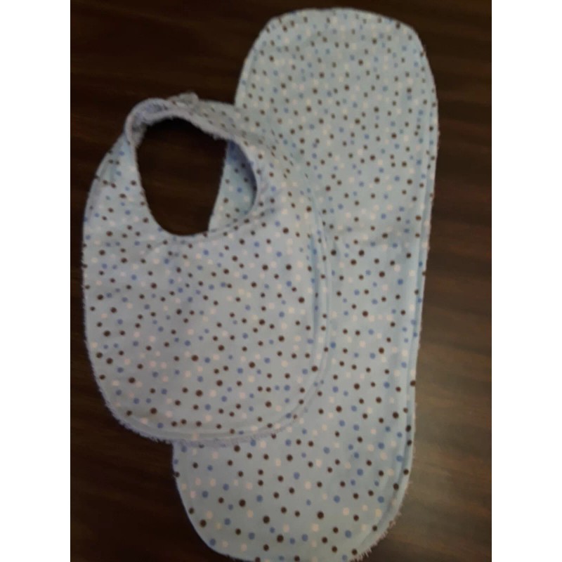 - infant burp pad and bib set is light blue with brown, blue and white dots