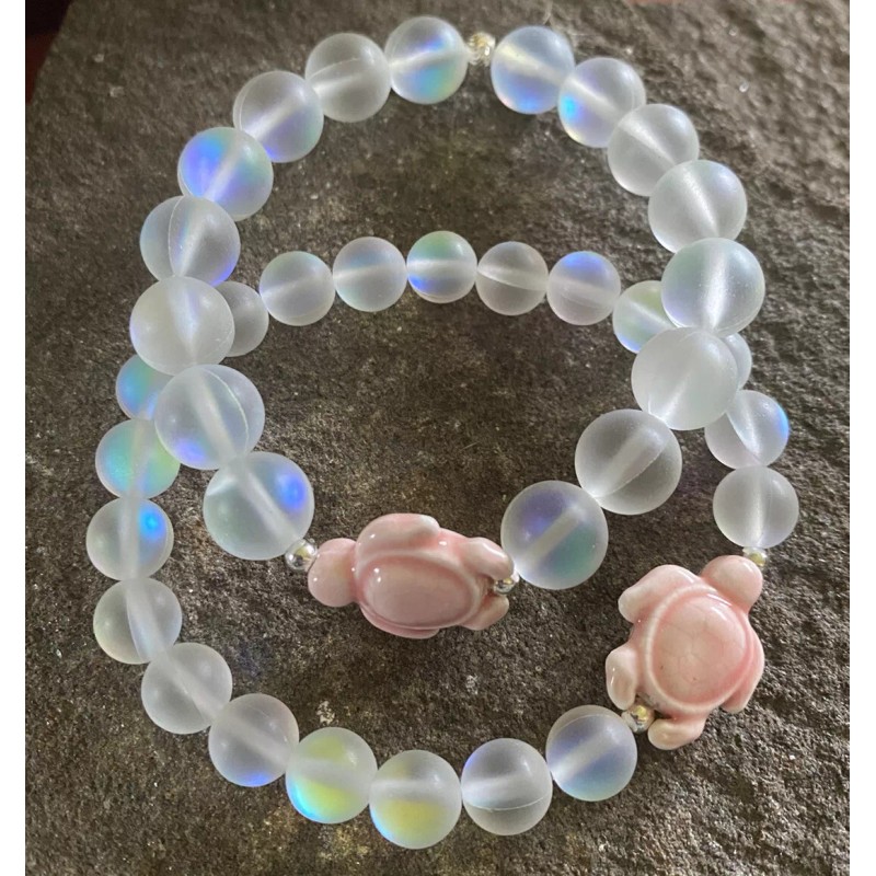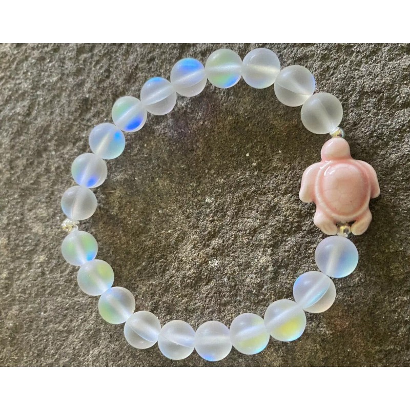 Handmade Iridescent Moonstone Bracelet Rainbow Glass Pink Turtle Sterling Silver Beads