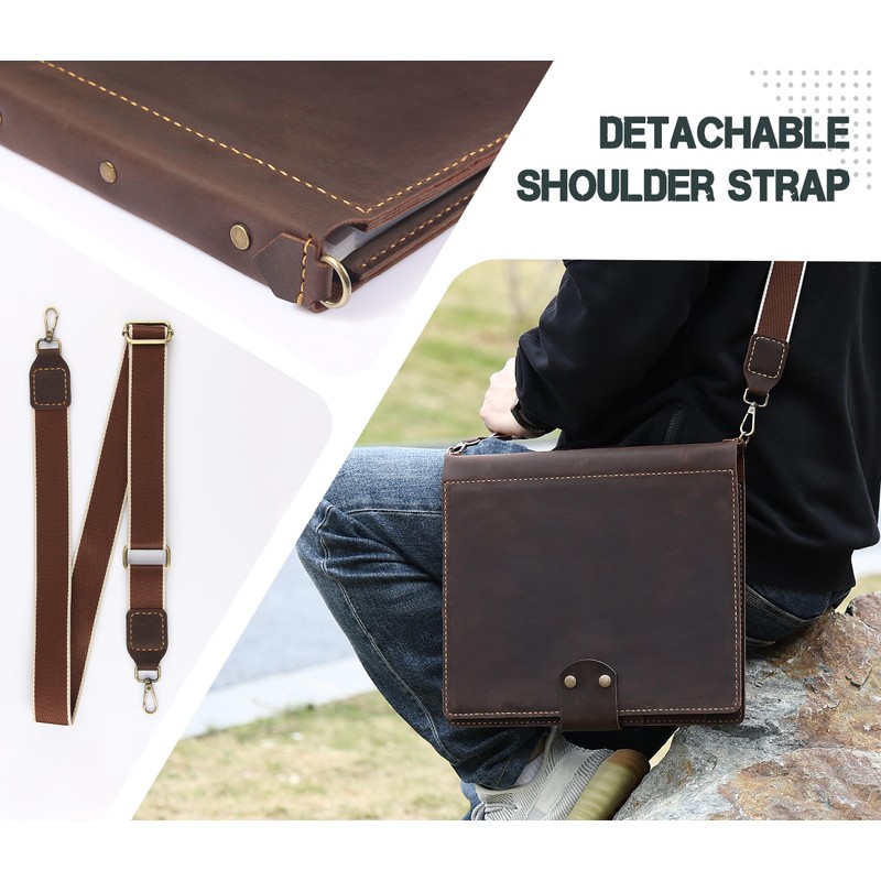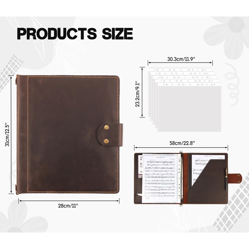 Handmade Leather Sheet Music Folder, 3-Ring Choir Binder with Clear Sheet Protectors, Premium Leather Portfolio for Music Organizer & Office Use - Coffee