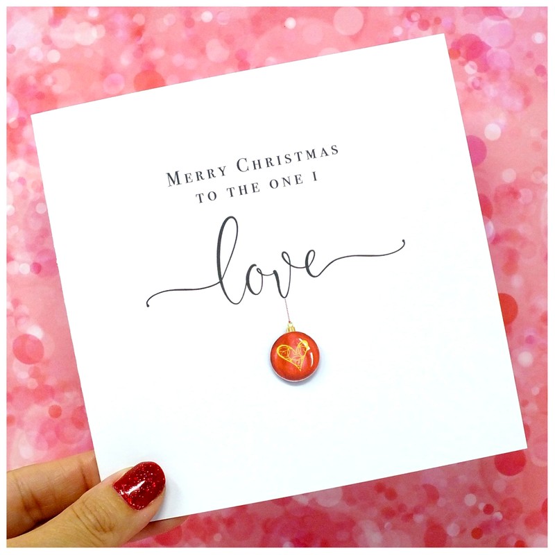 - * Beautiful Handmade Christmas Card * Merry Christmas To the One I Love - perfect for your own special someone, be it wife, husband, girlfriend, boyfriend, etc. A very simple, elegant design featuring a fabulous red Christmas tree bauble with heart in a matte finish which stands 2mm proud of the card surface, giving a very high quality, cushioned feel and a three dimensional effect - truly lovely quality and is the perfect way to let the one you love know how much you care this Christmas.