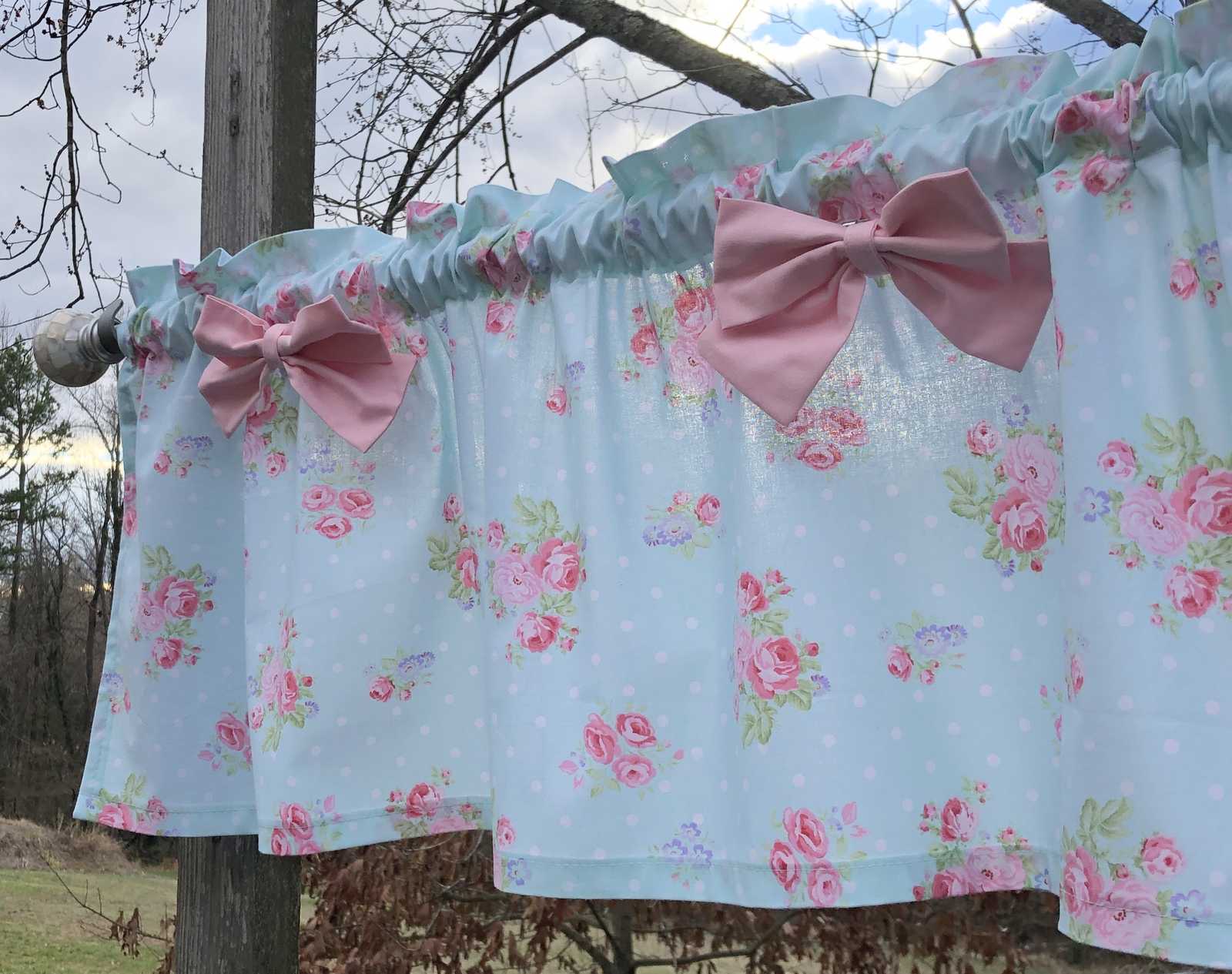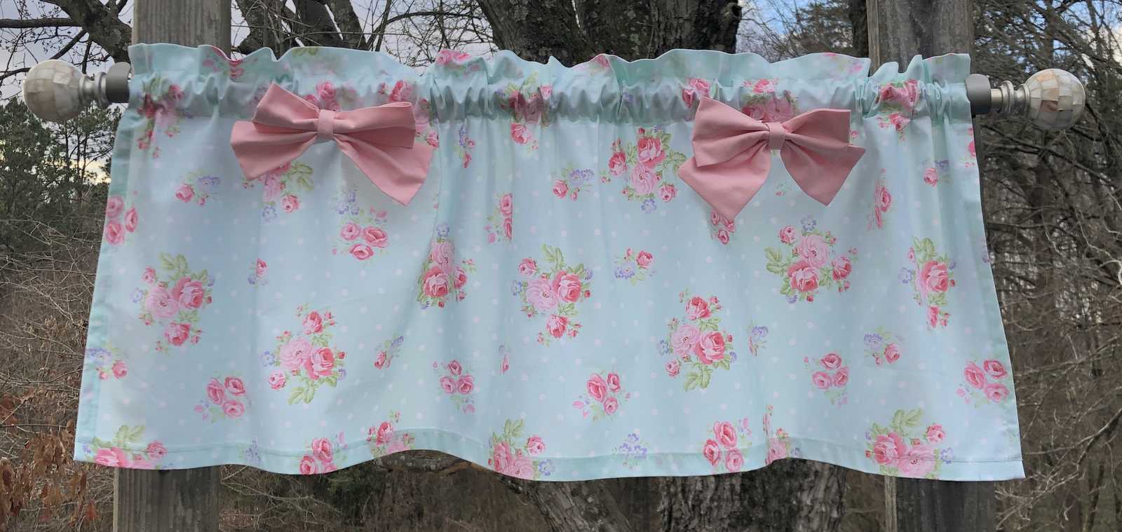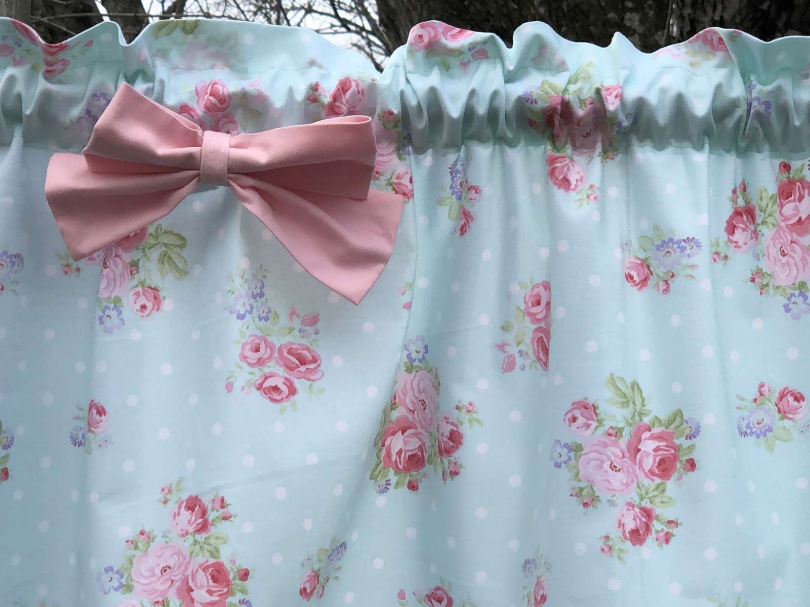 Pink Roses Light Blue Valance with Pink Bows Shabby Chic Floral Window Curtain t3/9