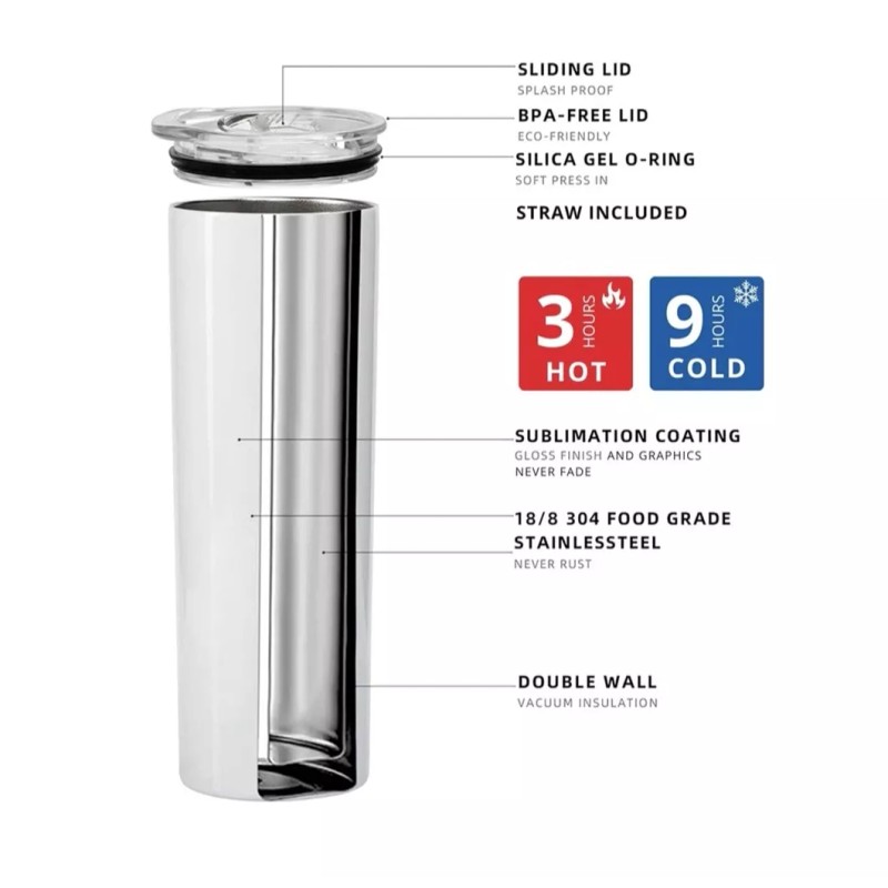Our stainless steel tumblers are insulated to keep drinks hot and cold for hours, everything is BPA free.