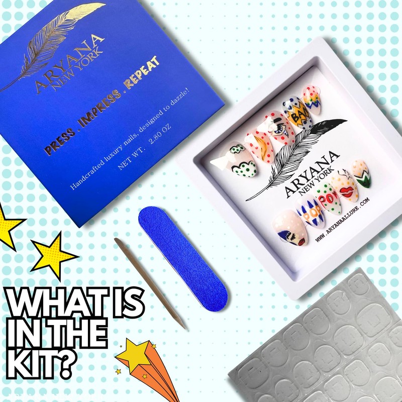 - The Complete Kit comes with 10 handcrafted press on nails, a cuticle pusher, 24 adhesive stickers, and a mini nail file for precise application. It also comes with a QR code for a step-by-step video tutorial on achieving the perfect fit, as well as instructions on removal and storage for your next application.