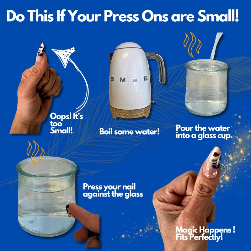 - *DO THIS IF YOUR PRESS-ON NAILS ARE TOO SMALL: Boil some water, pour it into a glass cup, and press your nails against the warm glass for 20 seconds. Voilà! It's magic – your nails will fit perfectly. For more tips, check out our videos for additional help!"