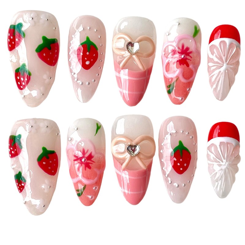 Transform your nails into a sweet and stylish masterpiece with these handcrafted press-on nails featuring a delightful strawberry design. Each nail is carefully hand-painted on a medium almond-shaped base, combining charming red strawberries with delicate 3D bow accents on a pristine white-pink backdrop. These reusable acrylic false nails offer both beauty and practicality, allowing you to achieve a professional-looking manicure in minutes. The design incorporates intricate details including tiny dots, subtle floral patterns, and dimensional elements that catch the light beautifully. Perfect for special occasions or everyday wear, these press-on nails provide a sophisticated yet playful look. The medium almond shape offers a flattering silhouette while maintaining practical wearability. Each set is meticulously crafted to ensure durability and can be reused with proper care and maintenance. Ideal for those who love feminine, fruit-inspired nail art but don't have the time for regular salon visits.