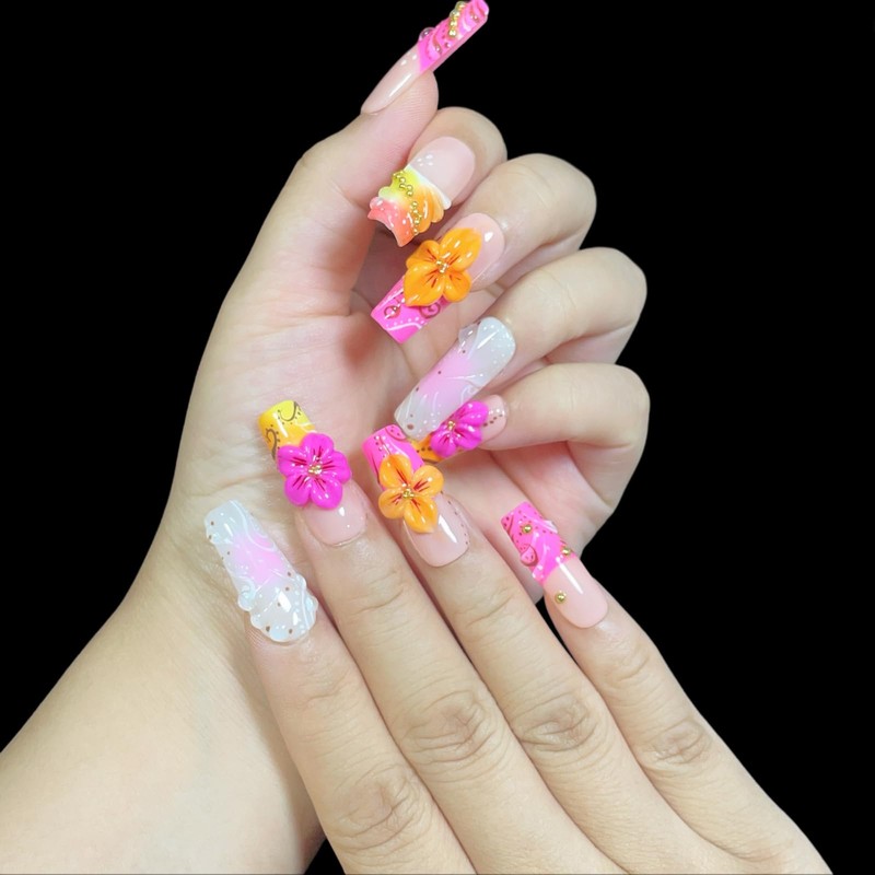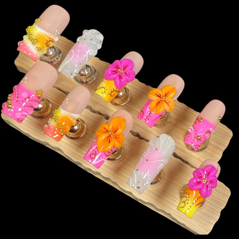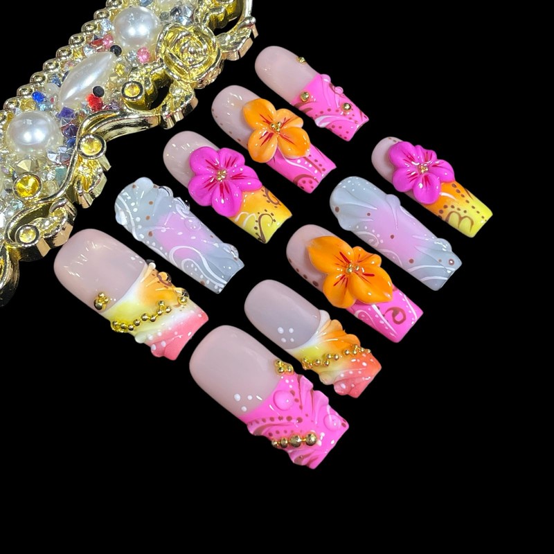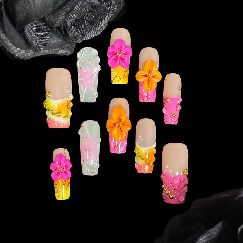 Handmade Press on Nails 3D Floral Medium/Long Square False Nails | Pink & Yellow Gradient | Bohemian Design| Reusable Acrylic Fake Nails (Sunburst, M)