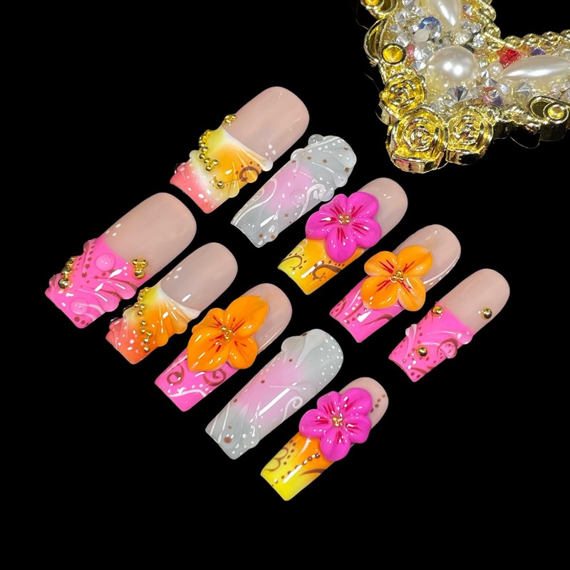 - Dual Design Variety: Mix large 3D orange-pink blooms + delicate filigree white patterns across 10 uniquely crafted nails.