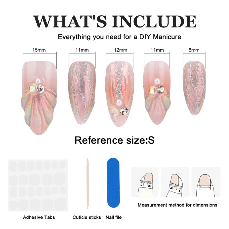 - 【Package Contents】Press-on nails (10 pcs), nail jelly adhesive tabs(24 pcs), a double-sided nail file, and a nail remover stick. Please refer to the product picture for how to measure and choose the size. It is recommended to use the jelly glue recommended below for the best results and reusability.