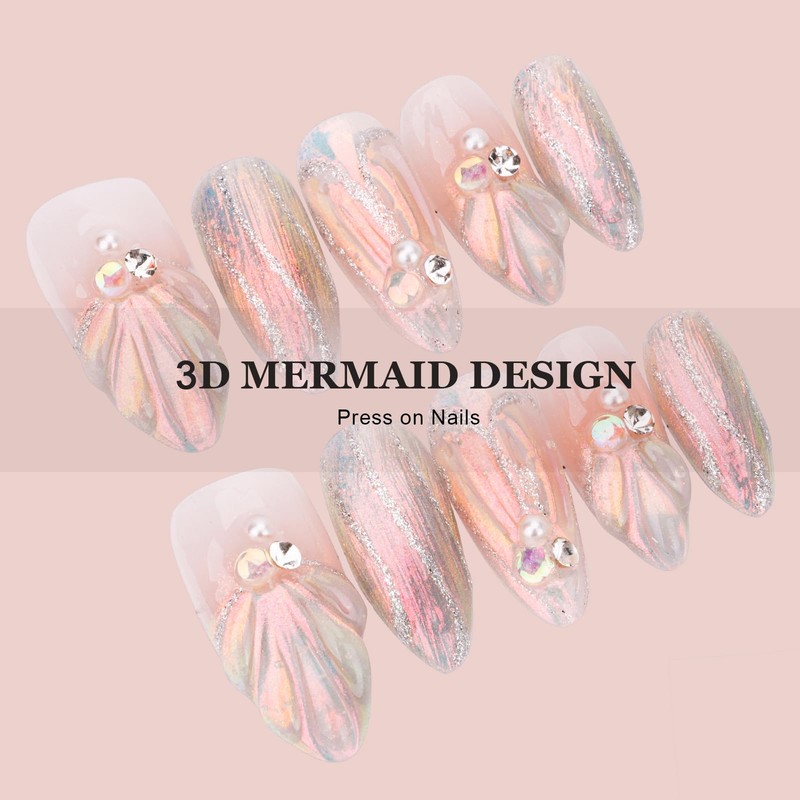Handmade Press On Nails, Atimory 3D Mermaid Aura Shell Press-On Nail, Medium Long Almond Oval False Nail Tips Almond False Nails Reusable with Nail Tool (XS)
