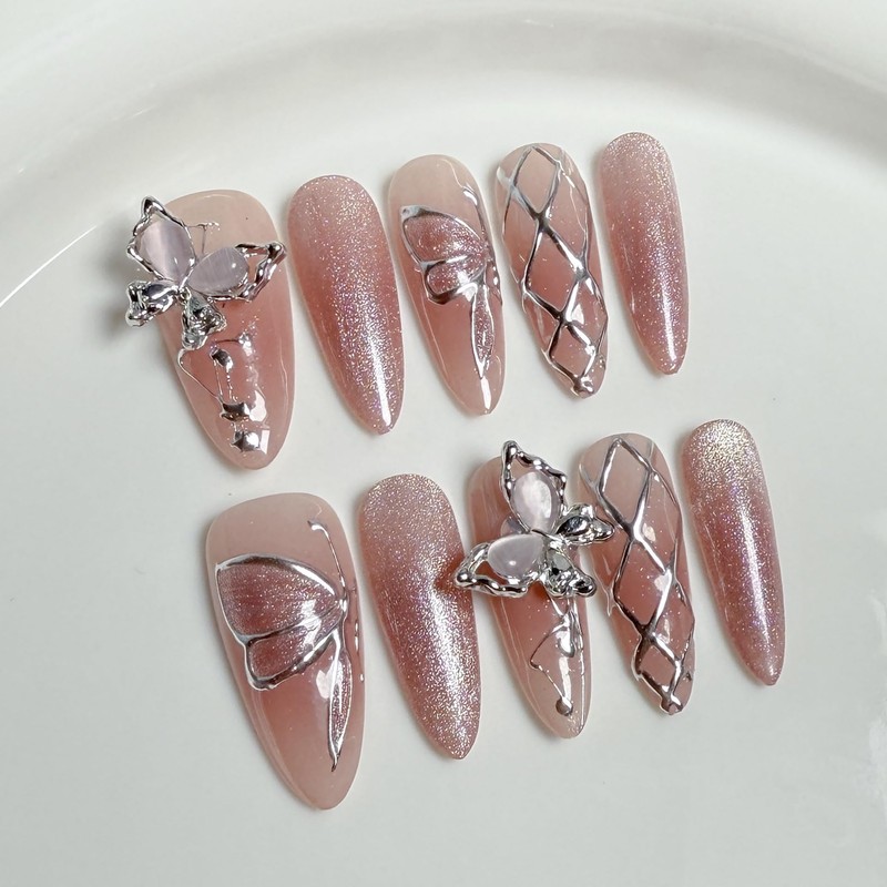 Handmade Press On Nails Long MouyouGlow, Almond Blush Pink 3D Diamond Butterfly Cat Eye Magnetic Geometric Y2K Coquette Black Resuable Fake Nails, Handmade Artificial Fingernails, 10 Pieces 407-S