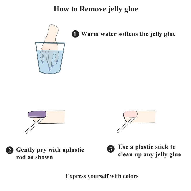 - 【Quick & Simple Application】Transform your nails in just 5 minutes! Begin by thoroughly cleaning your fingertips. Choose the appropriate size from our Small, Medium, and Large options (measure accurately to ensure a perfect fit), then apply a dab of jelly glue to your nails. Press the false nails firmly in place for 10 seconds. Allow the gel to set for at least an hour without getting your nails wet. For a hassle-free removal, simply soak your hands in warm water for 10 minutes. Gently lift the nails from the side to ensure false nails come off cleanly and without damaging your natural nails.